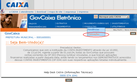 Para consultar transações concluídas, agendadas ou canceladas, passe o mouse sobre o menu "Consultas" e clique no item "Transações".
